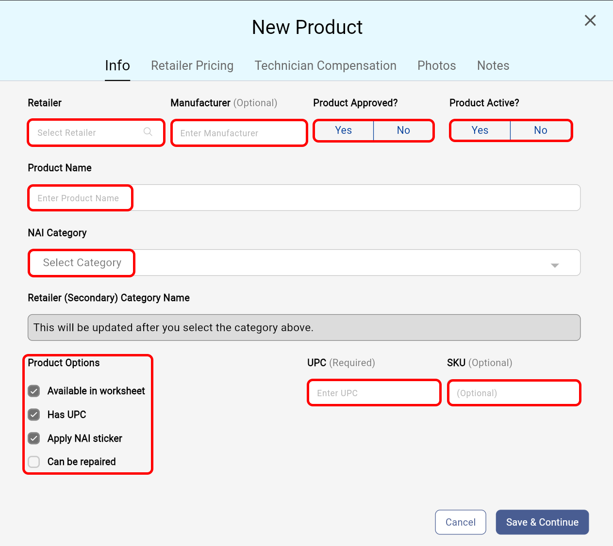 Input the product information in the appropriate fields on the Information Tab including the Retailer, Manufacturer, Product Name, UPC.