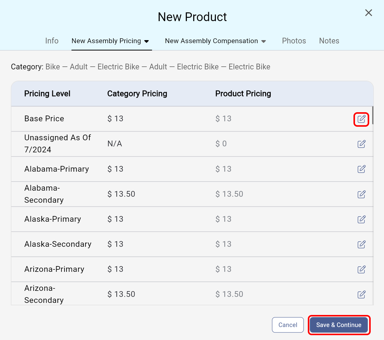 - Assign the New Assembly Pricing for the product by clicking on the Edit Icon. When complete, click on the Save and Continue button.