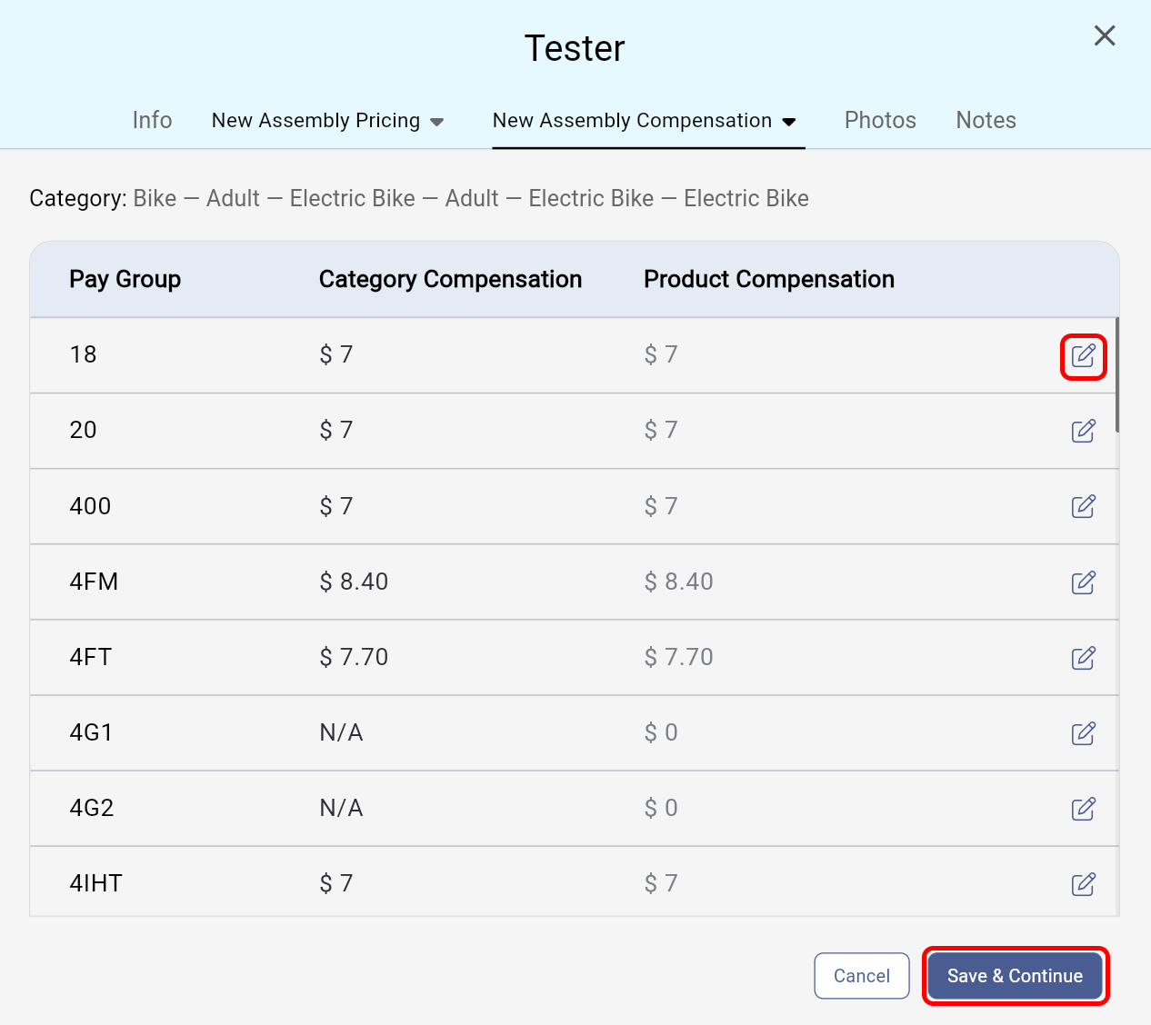 Assign the New Assembly Compensation to the new product for each pay group by clicking on the Edit Icon. When complete, click the Save and Continue button.