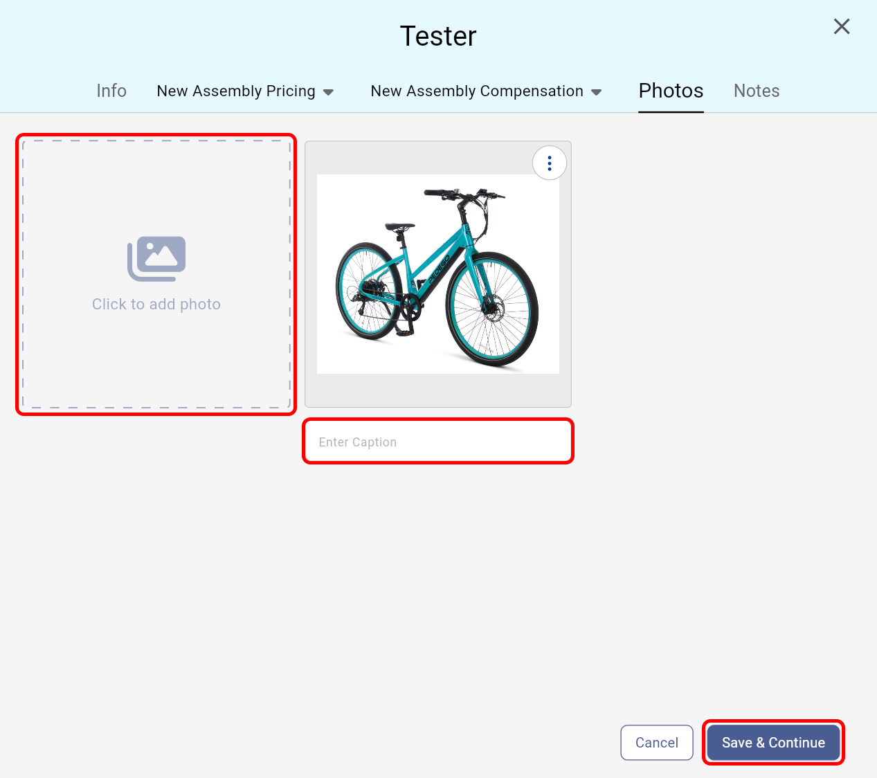 Add photos of the new product (if required) by clicking the Add Photo area and attaching the product photo. Enter a caption for the photo(s) then click Save & Continue.